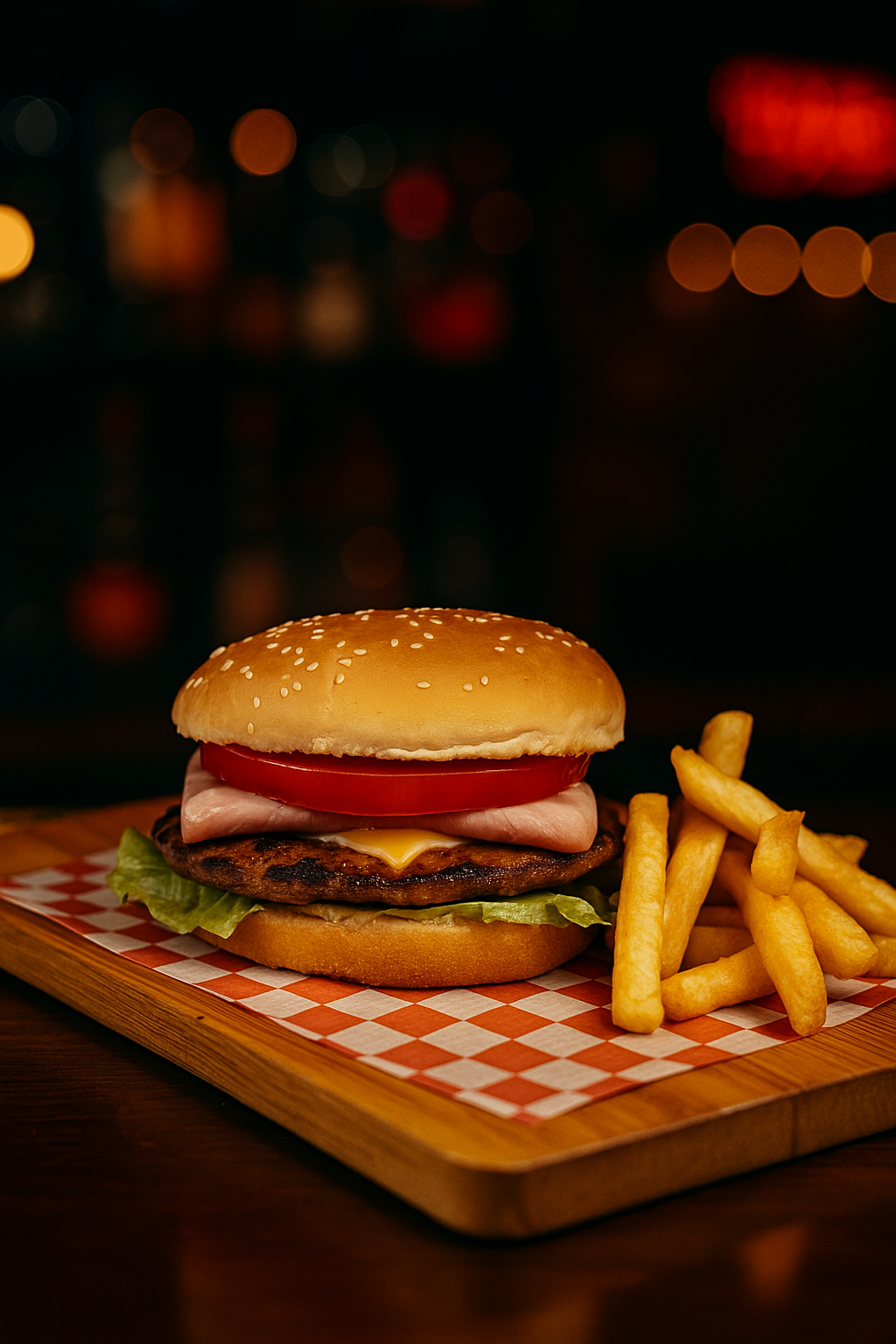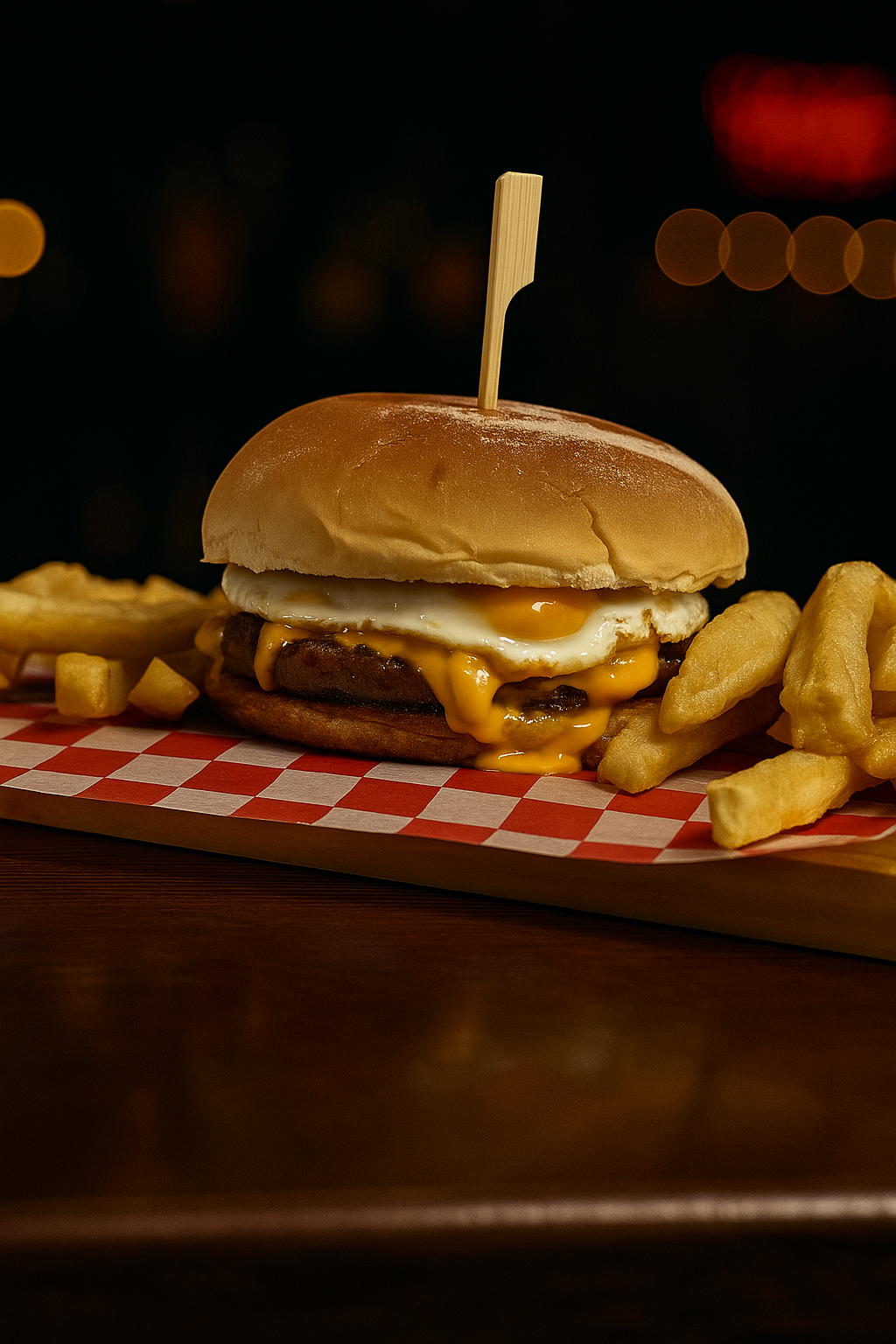 Doble medallón de carne, tomate, panceta, cheddar y huevo frito. Acompañado de papas fritas
