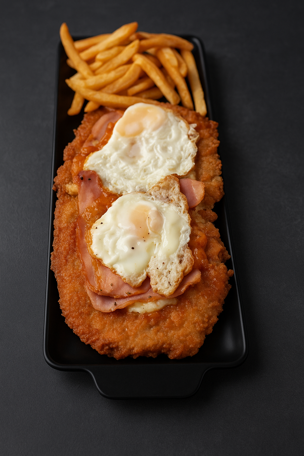 Milanesa napolitana (salsa de tomate, muzarella y jamón) con huevo frito y acompañado con papas fritas.