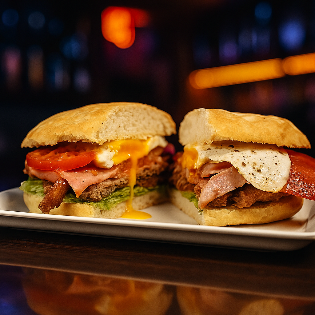 Sanwich de milanesa con jamón, queso, lechuga, tomate y huevo frito.