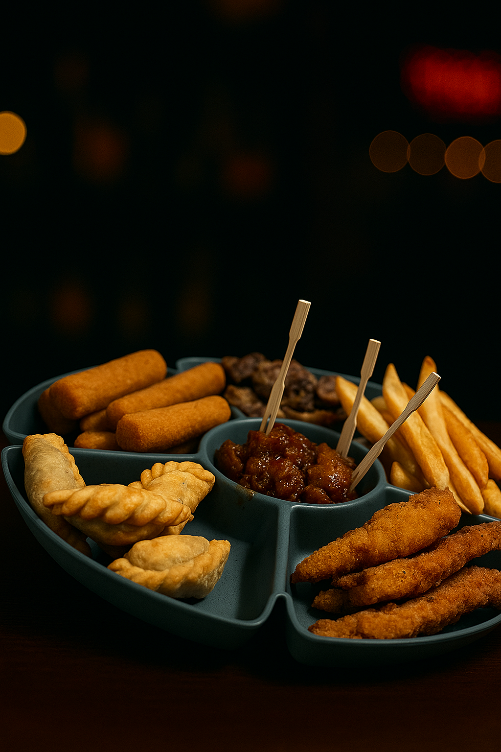 Contiene: bastones de muzza, chicken finger, papas fritas, empanaditas, albondiguitas y milanesitas